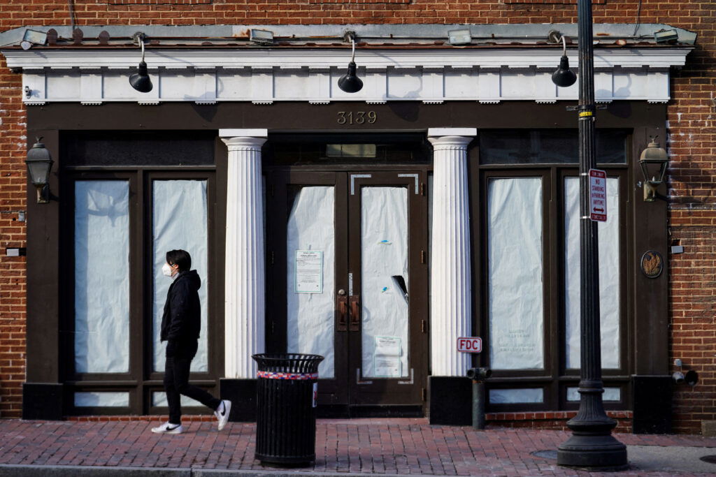A person wearing a protective face mask walks past a closed business in the Georgetown neighborhood in Washington, D.C. Jan. 31, 2022. The coronavirus disease pandemic has shuttered many businesses in the once bustling shopping district.
