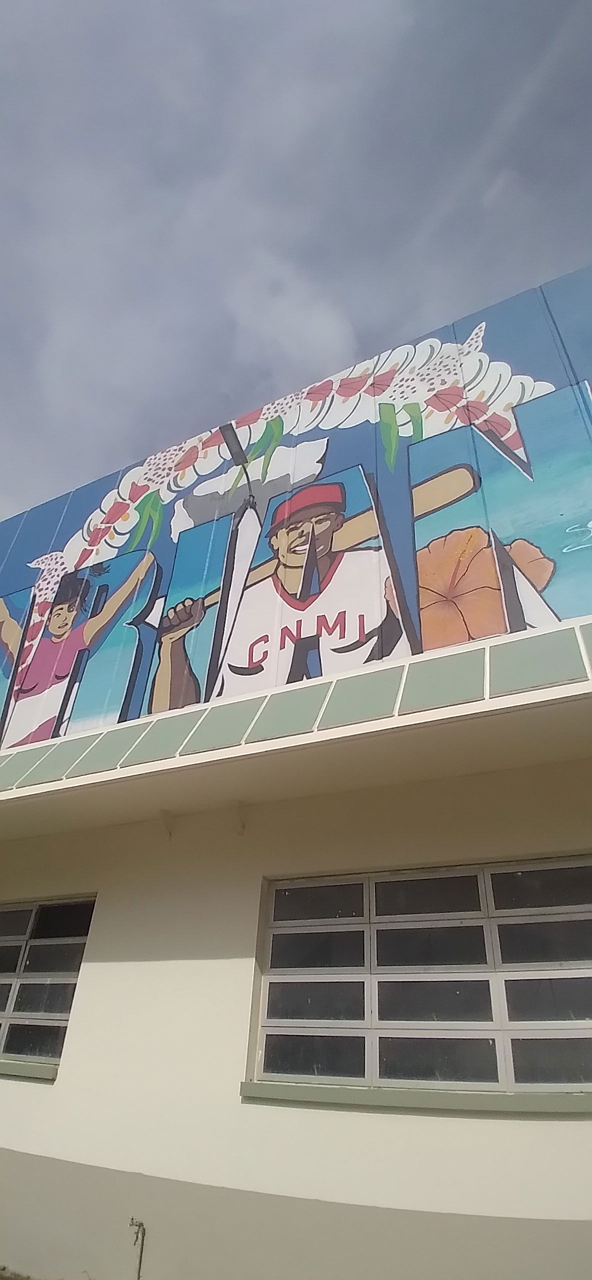 Additionally, this artwork on the gym is the street facing wall towards one of the island’s busiest highways. It is fully funded in part by the CNMI government’s Arts Council under the Department of Community and Cultural Affairs, and the U.S. federal government grants under the National Endowment for the Arts which have allowed for this cultural misappropriation against the natives to exist in this 21st century.