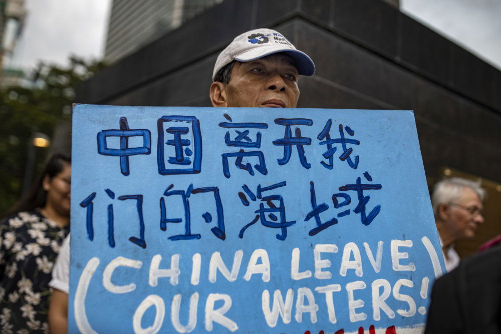 Filipinos take part in a protest condemning China’s incursion in the West Philippine Sea, on June 21, 2019 in Makati, Metro Manila.