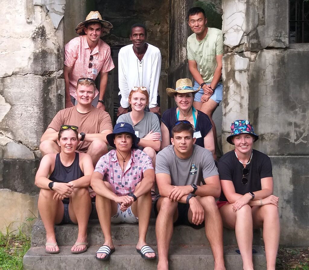 In search of Amelia Earhart at the Old Japanese Jail. Top: Midshipman Aidan Otero, Walt F.J. Goodridge (guide), Capt. Bob Qu. Middle: Midshipmen Carson Hillier, Ava Izenour and Col. Maria "MJ" Pallotta. Front: Midshipmen Becca Vavasseur, Molly Mangan, Charlie Sewell and Ellie Dabney.