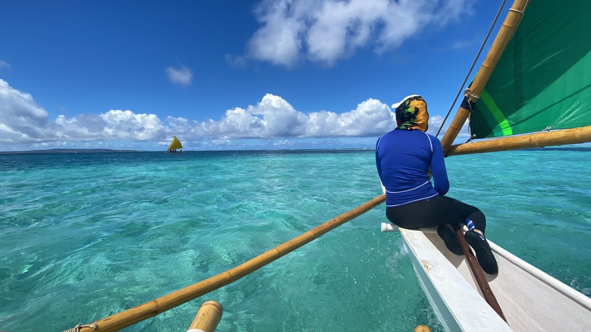 Issac Wright, who at the time was a Lalayak student, sits aboard the lucha, or outrigger of one of the canoes in 500 Sails’ fleet. 500 Sails aims to continue building the sailing capacity of island residents in the coming years.
