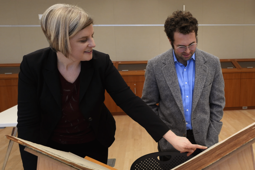 Max Chapnick, a postdoctoral teaching associate at Northeastern University, looks as Elizabeth Pope, curator of Books & Digital Collections, points out a writing by “E.H. Gould” at the American Antiquarian Society, Tuesday, Jan. 9, 2024 in Worcester, Mass.