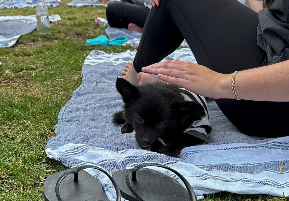 A yogi and an adoptable puppy share mat at stress-relieving outdoor Puppy Yoga hosted by Laughing Frog Yoga Studio, in Santa Monica, California, Aug. 1, 2024.