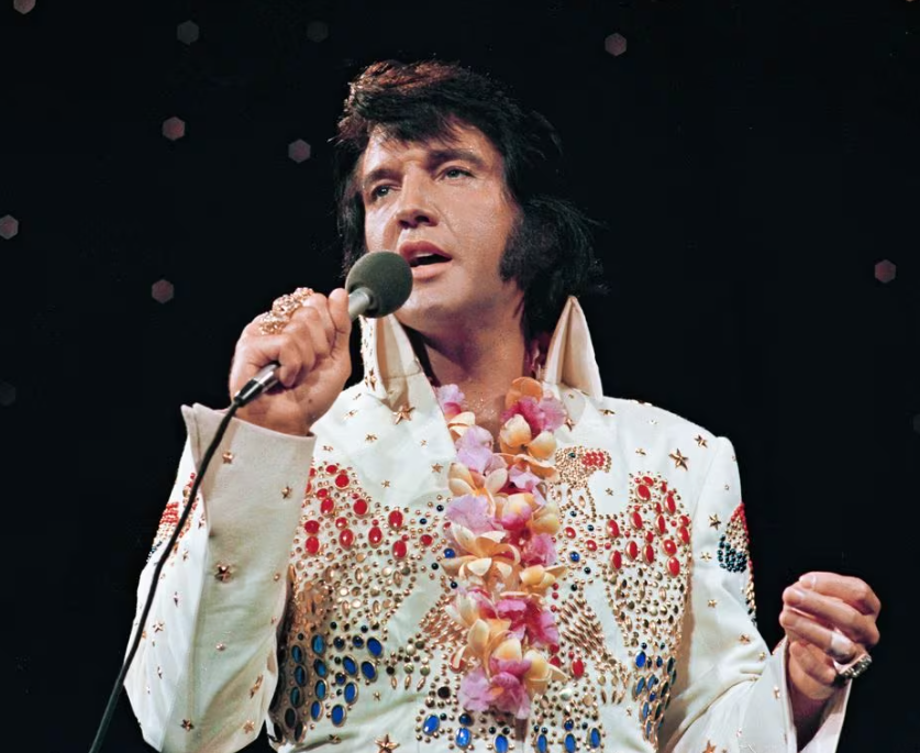 Elvis Presley performs at the “Aloha from Hawaii” concert special in Jan. 1973 in Honolulu, Hawaii in this handout image.