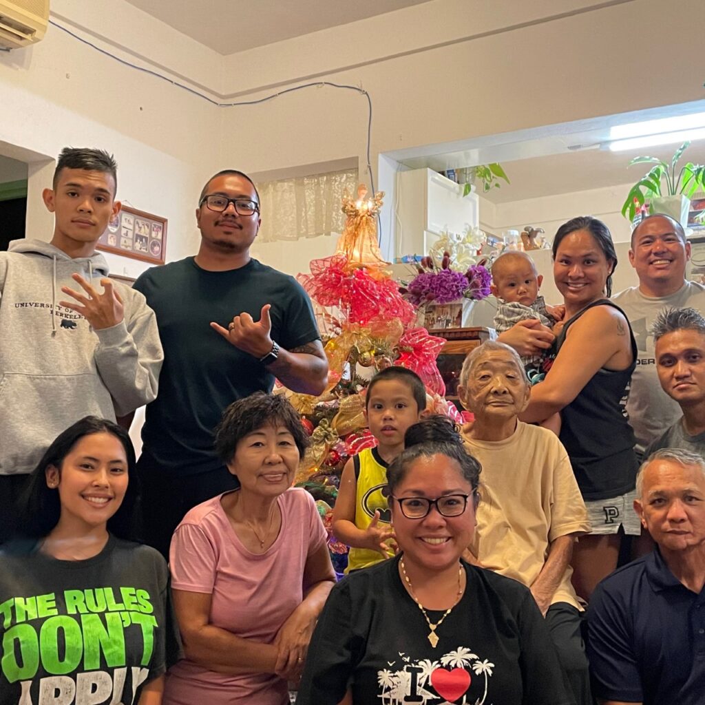 A family photo taken in Dec. 2021. Top, from left, standing: Kevin Chong, great-grandson; Peter Mendiola, spouse of Mai M.; Yosuke, great-grandson; “Obaachan,” seated; Kaito, great-grandson; Ai Chong, granddaughter; Jun Chong, grandson. Bottom, from left, seated: Isabela Deleon Guerrero; Mikie Chong, daughter; Mai Chong Mendiola, granddaughter; Vicente Tenorio Chong, son-in-law; Jacob Taisacan, fiancé of Ai C.