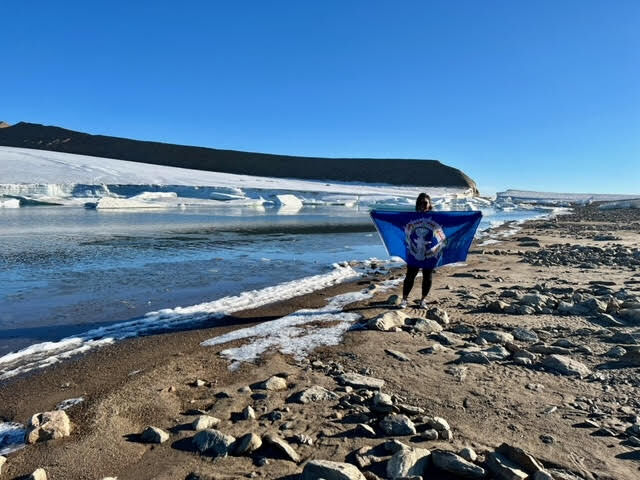 Air Force Master Sgt. Tiona Jones displays the CNMI flag for the first time in Greenland, right before taking the traditional “polar plunge” into arctic waters.