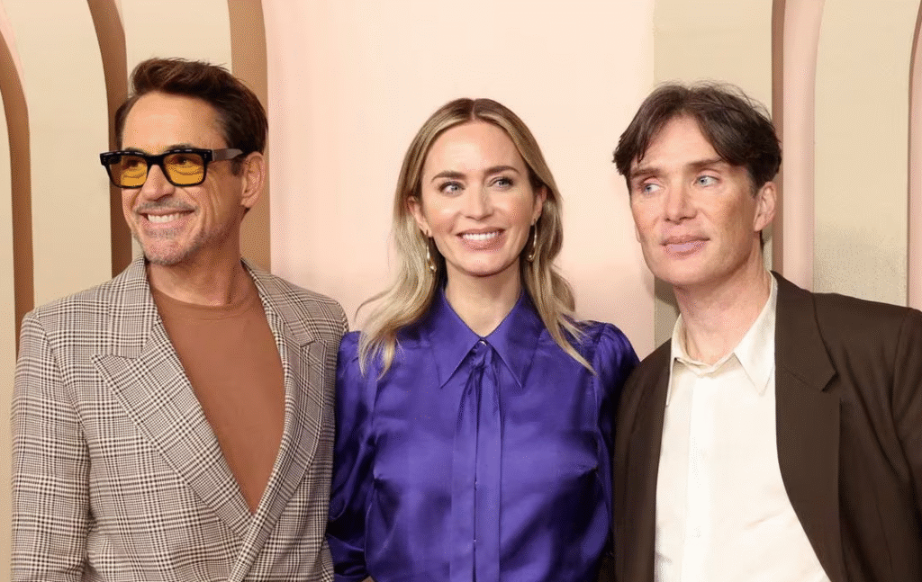 Cillian Murphy, nominated for Best Actor in a Leading Role, for “Oppenheimer,” Robert Downey Jr., nominated for Best Actor in a Supporting Role, for “Oppenheimer,” and Emily Blunt, nominated for Best Actress in a Supporting Role for “Oppenheimer,” which is also nominated for Best Adapted Screenplay and Best Picture, attend the Nominees Luncheon for the 96th Oscars in Beverly Hills, California, Feb. 12, 2024.