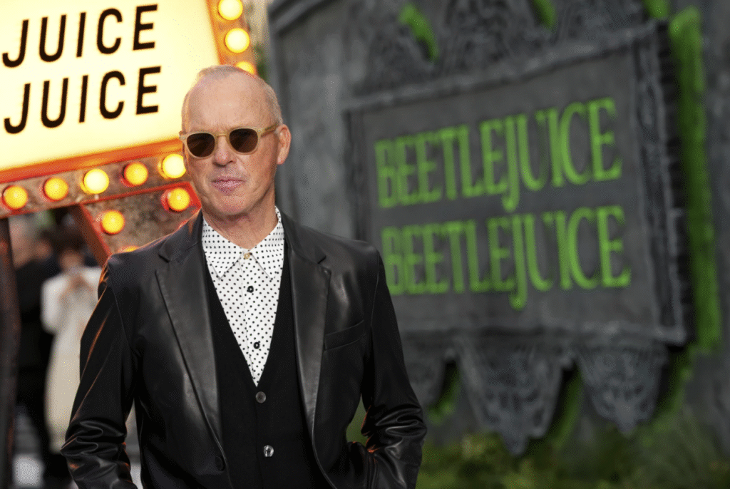 Michael Keaton arrives at the premiere of “Beetlejuice Beetlejuice” on Aug. 29, 2024 in London.