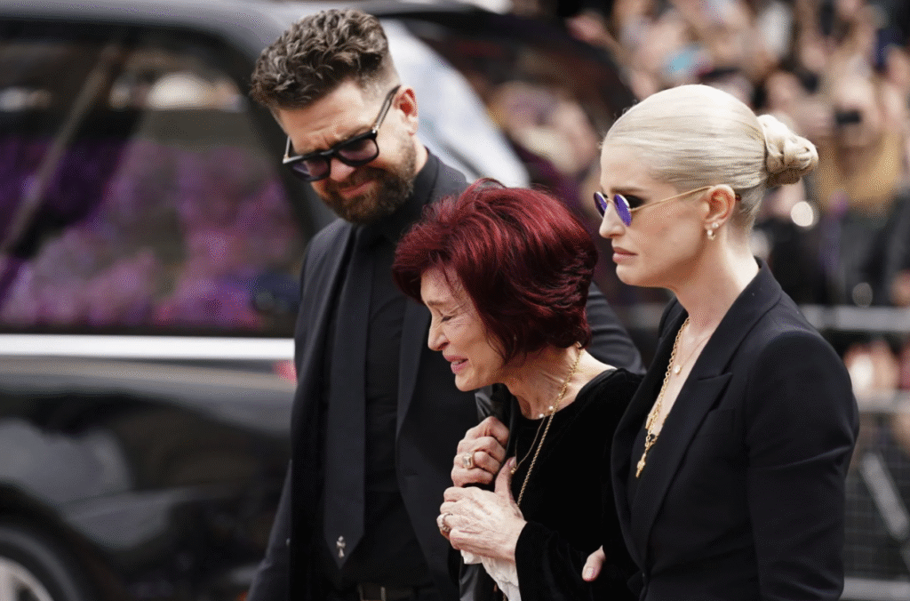 The family of Ozzy Osbourne from left, Jack Osbourne, Sharon Osbourne and Kelly Osbourne lay flowers and view the flowers left at the Black Sabbath Bridge bench on Broad Street in memory of Black Sabbath frontman Ozzy Osbourne ahead of the funeral procession, in Birmingham, England, Wednesday July 30, 2025.
