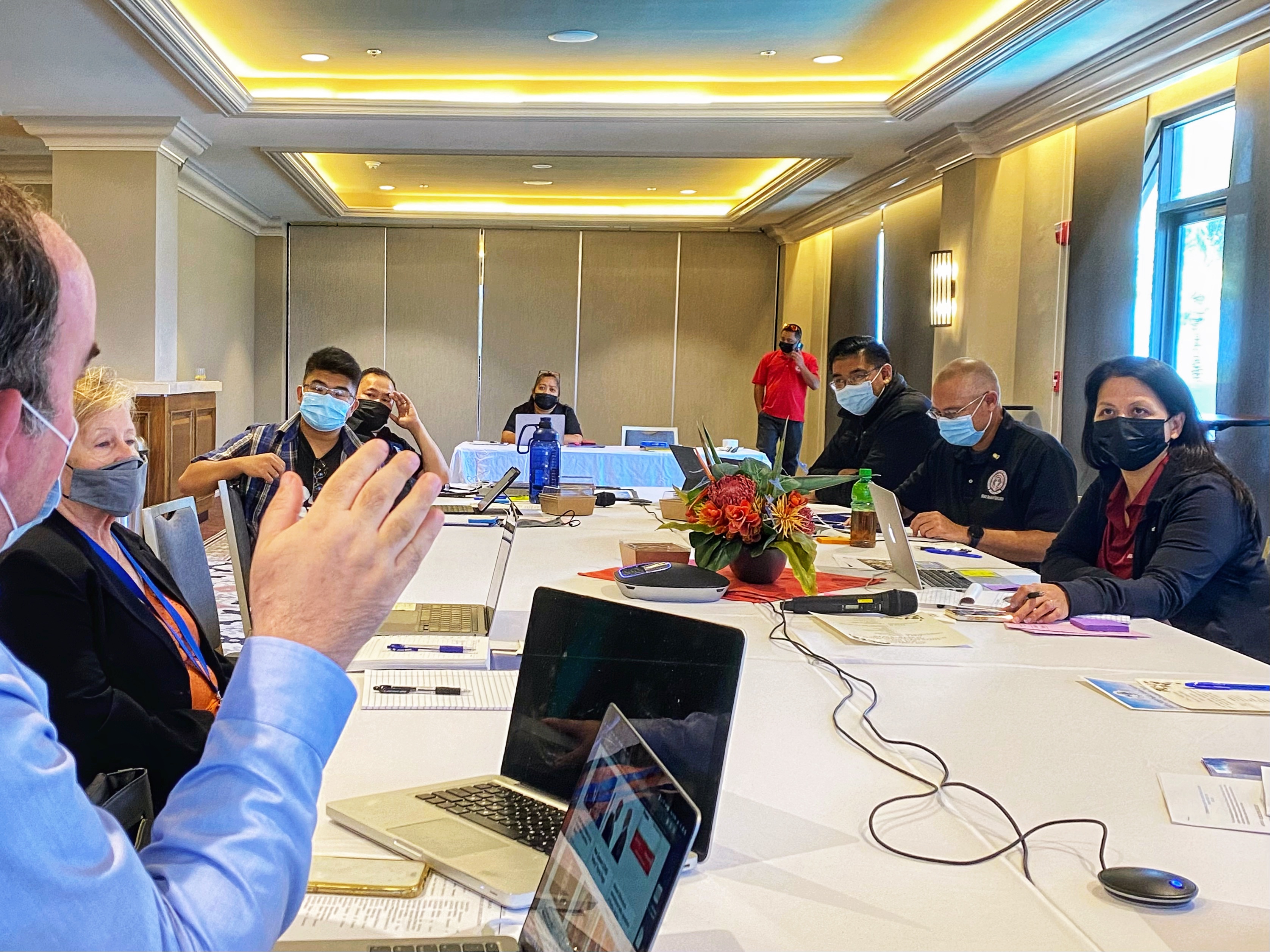 Legal counsel Michael Ernest, left, gestures as he speaks to members of the Board of Education: Chairman Gregory Pat Borja, Vice Chairman Antonio Borja, Secretary/Treasurer Maisie B. Tenorio, teacher representative Phyllis Ain, student representative Jed Sta. Theresa and Commissioner of Education Dr. Alfred B. Ada. Not in photo: non-public school representative Dr. Ron Synder. BOE member Herman Atalig participated virtually. The Public School System’s policy and governing body, the BOE is holding a two-day meeting that started Thursday.