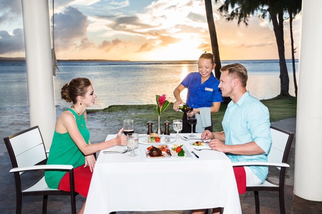A couple enjoys a romantic sunset dinner at PIC’s Seaside Grill.
