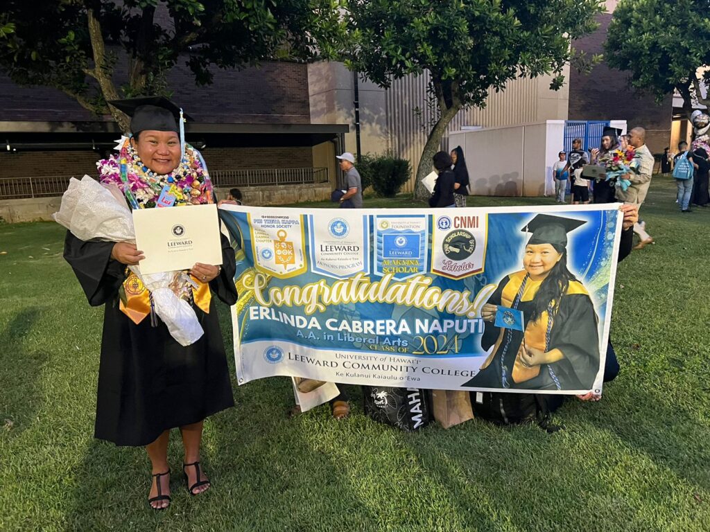 “I believe that education is a lifelong journey, and I am grateful for the opportunity to continue learning and growing as a professional. My goal was to graduate with my AA degree before I turned 50,” Erlinda stated.  “Leeward CC has provided me with a solid foundation, bringing me one step closer to realizing this dream of earning a four-year degree. With a heart filled with unwavering passion, I embark on the next chapter of my educational journey. I thank my entire family, my children, my grandchildren, and most especially my husband Martin for their support. I thank my incredible Team Joeten-Kiyu Public Library, my friends, and everyone who supported and believed in me. I am so blessed. Si Yu’us Ma’ase.”