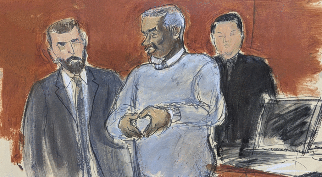Sean “Diddy” Combs, center, motions a heart sign to his family in attendance as he is escorted out of lock-up by U.S. Marshals on the first day of trial, Monday, May 12, 2025 in New York.