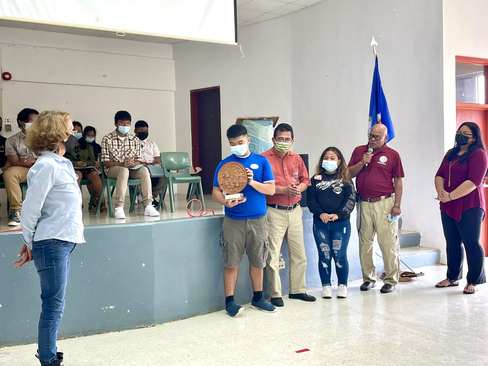 In honor of Principal’s Month, Board of Education Vice Chairman Herman Atalig and student representative Jed Santa Theresa presented a carved CNMI Seal as a gift to Dr. Rita Hocog Inos Jr. Sr. High School Principal D. Tanya King. She was also lauded for her 32 years of continuous service to Rota in various capacities as an educator. Also in photo are Rota Mayor Efraim Atalig, Rota Youth Sen. Abriette Manglona, and the Rota mayor’s assistant for special projects and grants, Aubry Hocog, a former student representative herself.