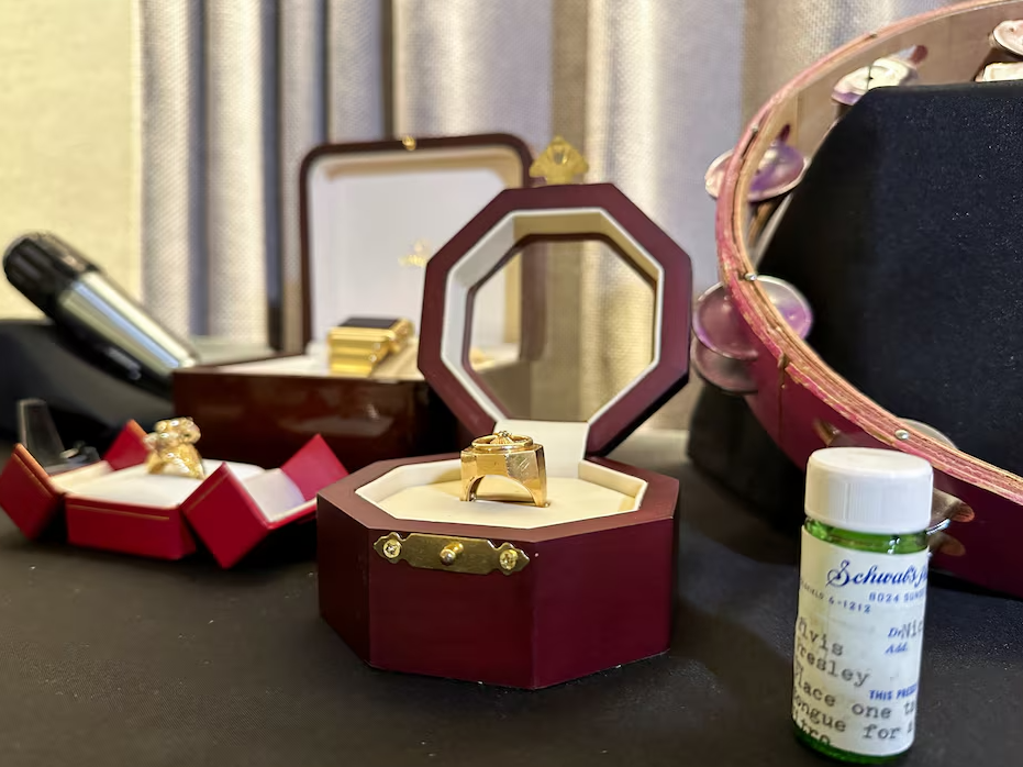 Among the top lots are several items that belonged to Presley, including a microphone from the performer’s Las Vegas residency, a pill bottle marked March 1977, and two unique gold rings, which are estimated to sell for $35,000 to $60,000.