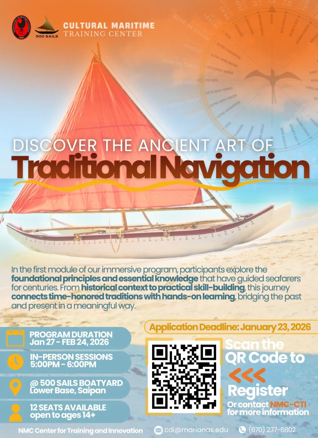 (NMC) — Northern Marianas College–Center for Training and Innovation, together with 500 Sails, is opening enrollment for the fifth cohort of its Cultural Maritime Training Center: Traditional Navigation – Module I program.