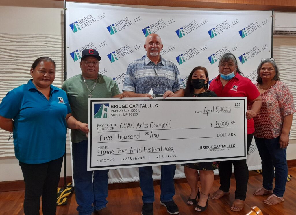 The Commonwealth Council for Arts and Culture recognizes Bridge Capital as a Pacifica Sponsor for the 39th, 40th, and 41st Flame Tree Arts Festival. Bridge Capital donated $5,000 in support of the event and has always been very supportive of the festival over the years. Thank you Bridge Capital! In photo: from left, Abick Muna, and Gloriana Teuira from the Arts Council, Julie Duenas and Bart Jackson from Bridge Capital, Jeff Cabrera from the Saipan Mayor’s Office and Erica Trinidad from the Arts Council.