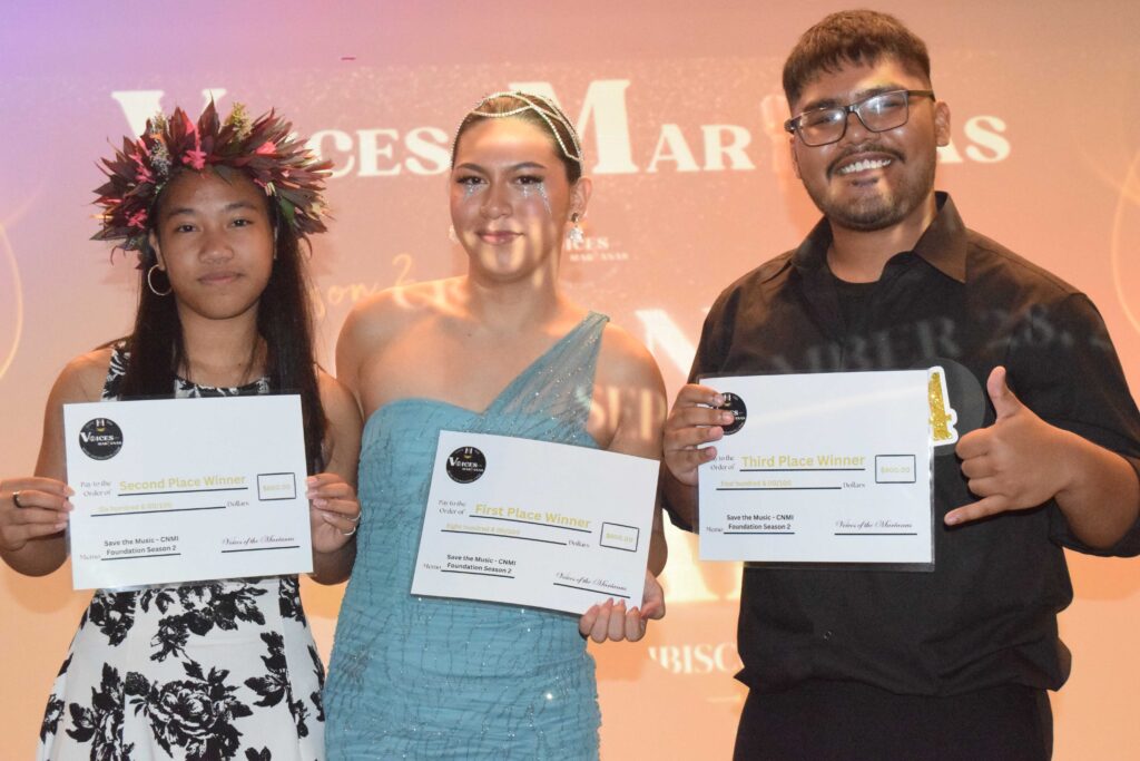 Franko Deleon Guerrero, center, Karlymae Lizama, and Jason Lizama display their awards at the conclusion of Voices of the Marianas Season 2 grand finale at the Crowne Plaza Resort’s Hibiscus Hall on Saturday.