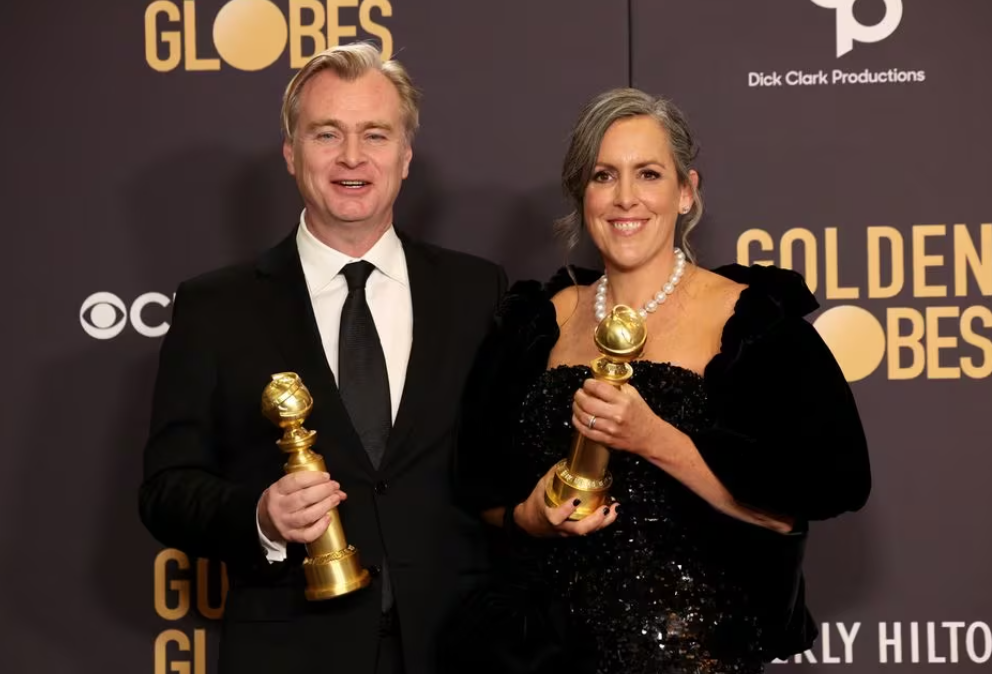 Christopher Nolan and Emma Thomas pose with the awards for Best Director and Best Motion Picture – Drama at the 81st Annual Golden Globe Awards in Beverly Hills, California, Jan. 7, 2024.