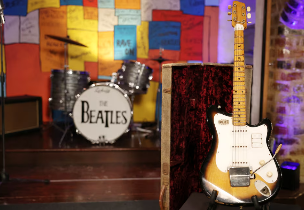 LIVERPOOL (Reuters) — An electric guitar played by the late guitarist George Harrison in the early days of the Beatles will go up for sale at an auction next month where it could be sold for more than $800,000.