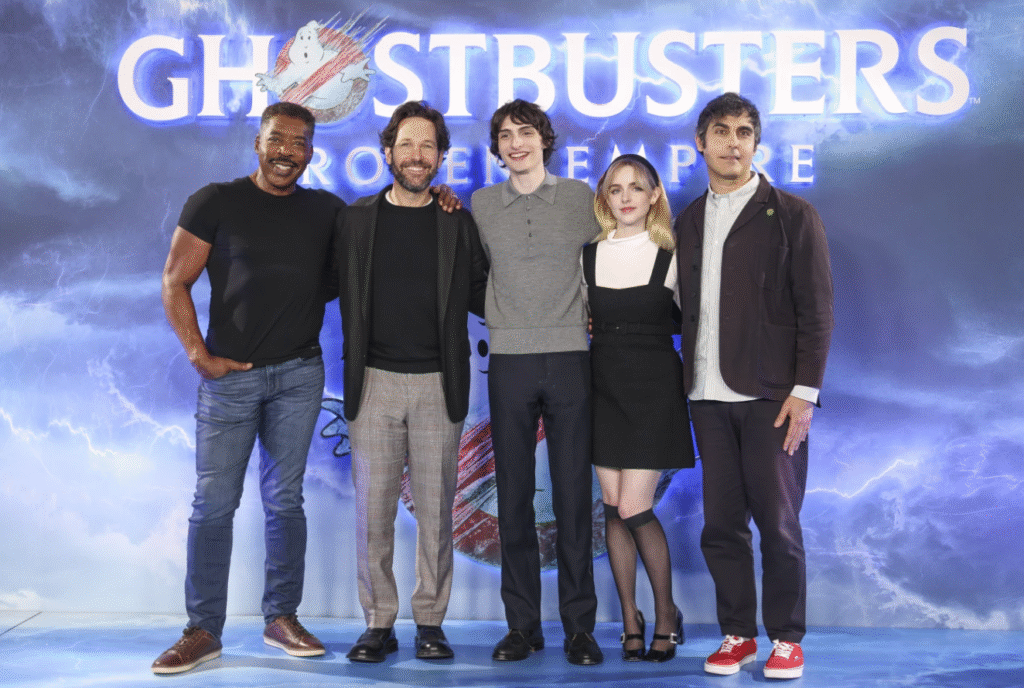 From left, Ernie Hudson, Paul Rudd, Finn Wolfhard, McKenna Grace and director Gil Kenan pose for photographers at the photo call for the film “Ghostbusters: Frozen Empire” on March 21, 2024.