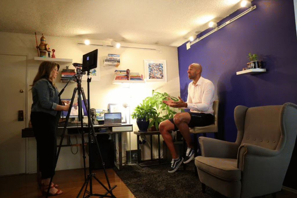 Acting coach and actor Jessica Payne, left, reads a script with actor Loren G. Woods during a self-tape coaching session at her home in West Hollywood, California, Aug. 18, 2023.