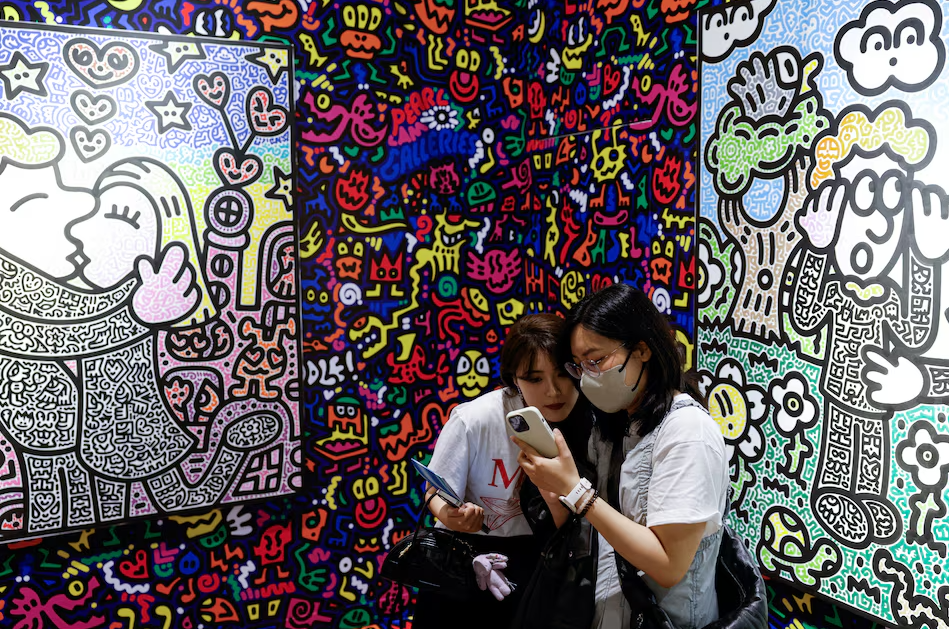 Artworks by Mr Doodle are displayed at Art Basel in Hong Kong, March 26, 2024.