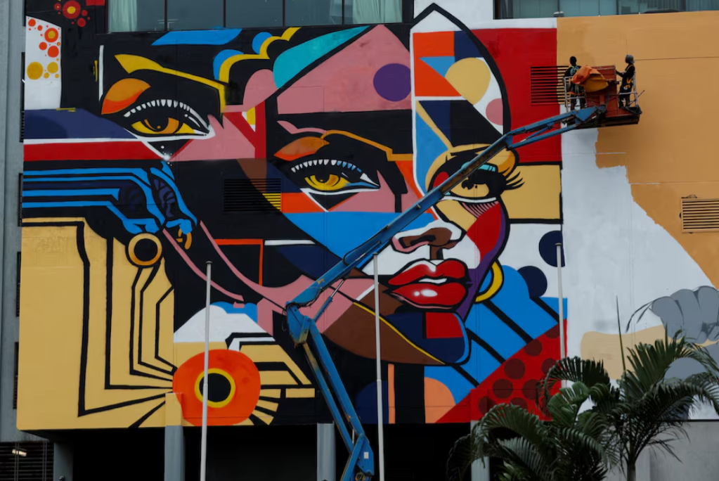 Street artists who came to participate in the first edition of Graff Ivoire, paint a mural on the facade of the Pullman hotel, in Abidjan, Ivory Coast, Nov. 17, 2024.