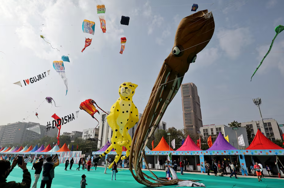 People in Gujarat celebrate Uttarayan, a Hindu festival in mid-January that celebrates the end of winter by flying kites held by glass-coated or plastic strings.