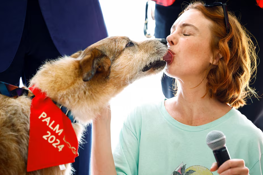 Kodi, the dog of the film “Le proces du chien” (Dog on Trial), winner of the Palm Dog, the award for the best canine performance, licks director Laetitia Dosch’s face, during the 77th Cannes Film Festival in Cannes, France, May 24, 2024.