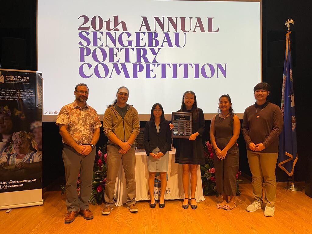 Saipan Southern High School’s Yu Rong Jiang, center, won the 20th Sengebau Poetry Competition with her original poem, “Reminders of Home.”