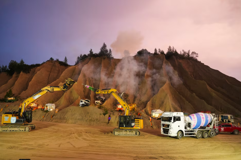 Heavy machinery is seen in Shakespeare’s “Romeo and Juliet” theatre adaptation, where heavy goods vehicles and cars take on the roles of the famous characters, in Rummu, Estonia, July 31, 2025.REUTERS