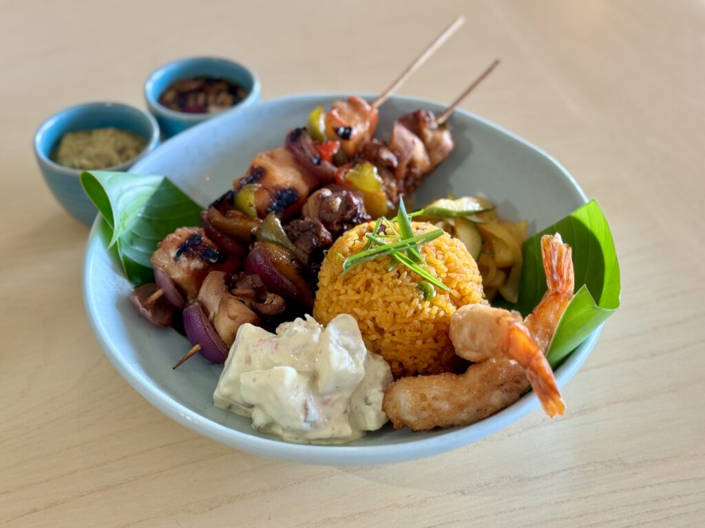 Indulge in our mouthwatering Loco Local BBQ set, featuring red rice, potato salad, pork BBQ sticks, crispy shrimp rolls, and sauces to pair, including fina’denni and denanche, all for just $12.