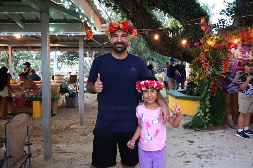 Suna Kurtoglu, right, and her father, Orhan Kurtoglu, pose with their mwars at the Marianas Flower Festival.