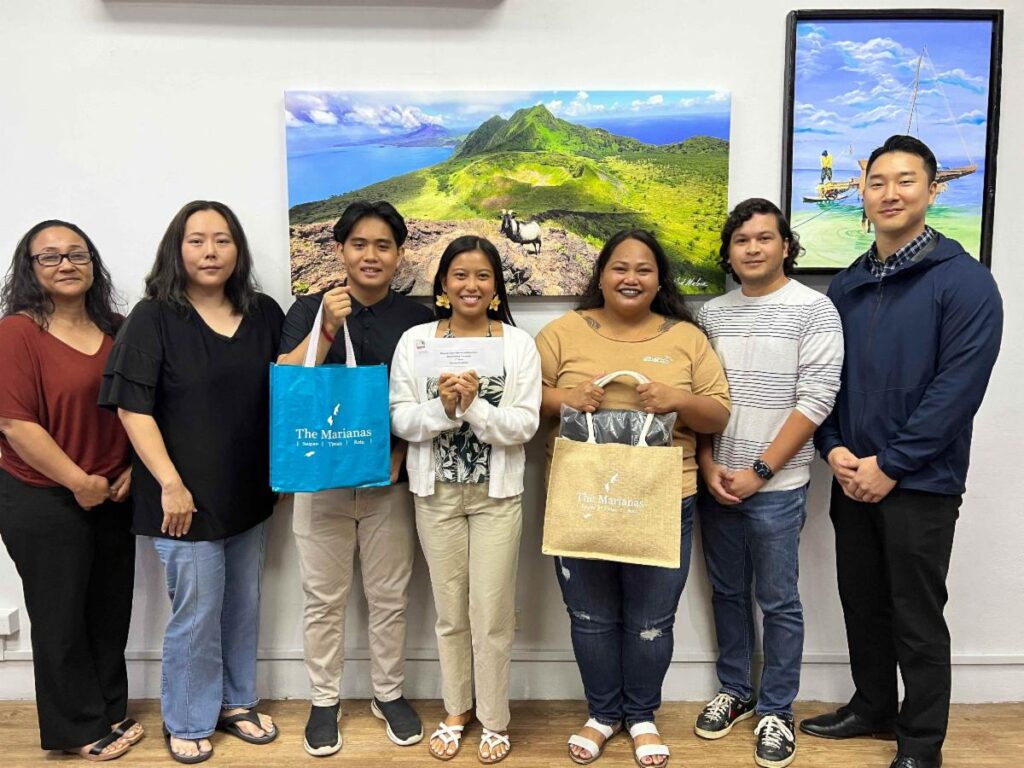 First place winner Patricia Castillon (@_chuchai), center, and other winners of the Marianas Visitors Authority’s #MarianasAdventure Campaign are awarded for their winning Instagram videos promoting the destination on Dec. 16, 2024, at the MVA office in I Liyan, Saipan. From left, MVA Marketing Specialists Brenda Repeki and Skye Seo, 3rd place winner Deejay Santomin (@svwfctr), Castillon, 2nd place winner Antonette Castro a.k.a. Netty Cee (#nettyceeofficial), MVA Media Marketing Specialist Ezra Lizama, and MVA Marketing Manager Thomas Kim.