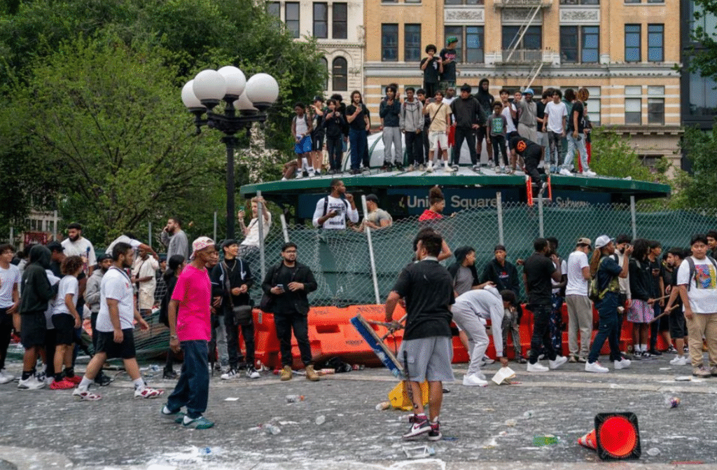 NEW YORK (Reuters) — Thousands of people overran New York City’s Union Square and the surrounding streets on Friday in a chaotic scene after a popular live streamer announced a “giveaway” event, with police struggling to contain fans throwing projectiles and injuring officers.