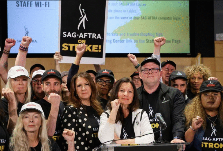 SAG-AFTRA union President Fran Drescher, Duncan Crabtree-Ireland, SAG-AFTRA National Executive Director and Chief Negotiator, and union members gesture at SAG-AFTRA offices after negotiations ended with the Alliance of Motion Picture and Television Producers, triggering an actors’ strike, in Los An…