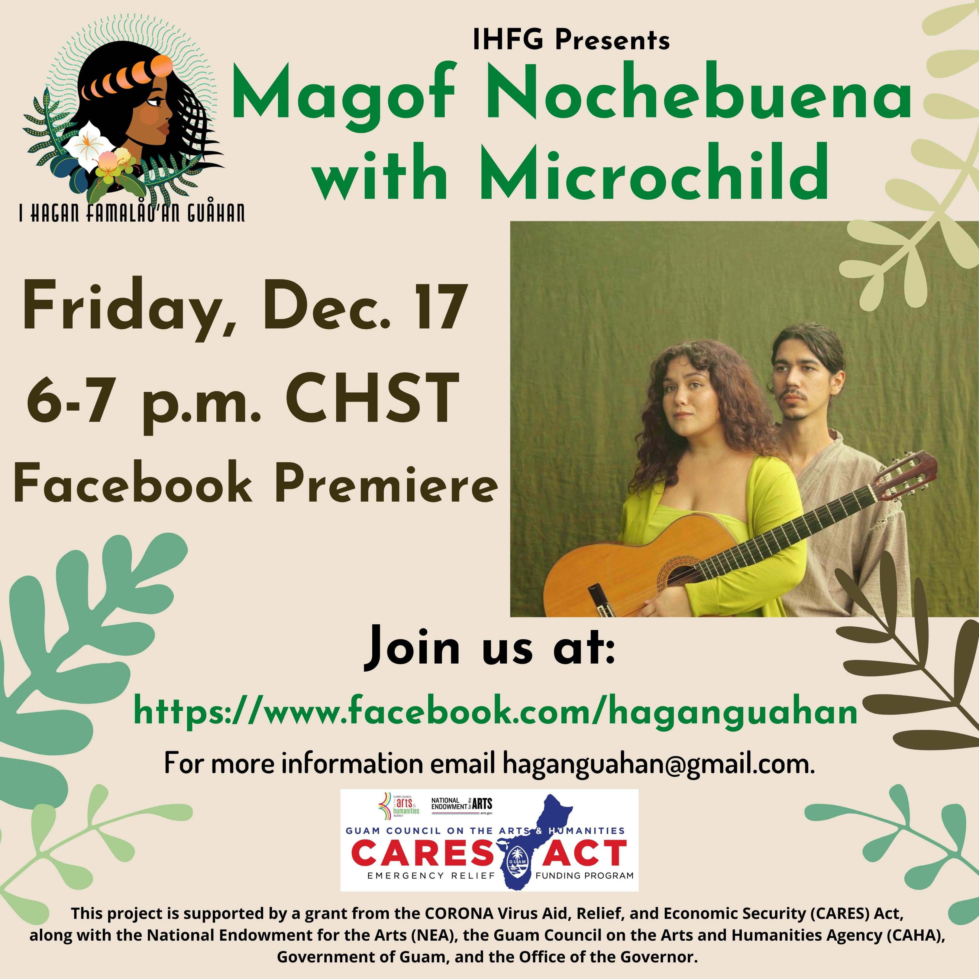 IHFG also presents Magof Nochebuena with Microchild on Friday, December 17, at 6 p.m. on our Facebook page https://www.facebook.com/haganguahan. For this special premiere on Facebook, Shannon McManus, Jon Glaser, and Siobhon McManus will perform their renditions of popular CHamoru Christmas songs.