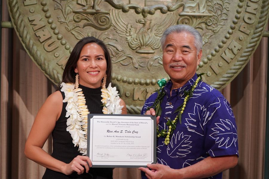 Congratulations to Rica Ann Dela Cruz, the 2022 Robert Murakami Scholarship recipient! Rica grew up on Saipan in the Commonwealth of the Northern Mariana Islands. By attaining a PhD in Public Health, she wants to contribute more research and knowledge on how to improve the health of indigenous people in the Micronesia region. Dela Cruz’s goal is to expand cross-sectoral capacity building and conduct community-based research that will produce culturally-tailored interventions and introduce evidence based health policies for the underserved people of Micronesia. Photo shows Dela Cruz, left, with Hawaii Gov. David Ige.