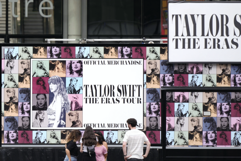 A family looks at a Taylor Swift merchandise kiosk at Wembley Stadium in London, Wednesday, Aug. 14, 2024, ahead of a series of concerts starting Thursday.