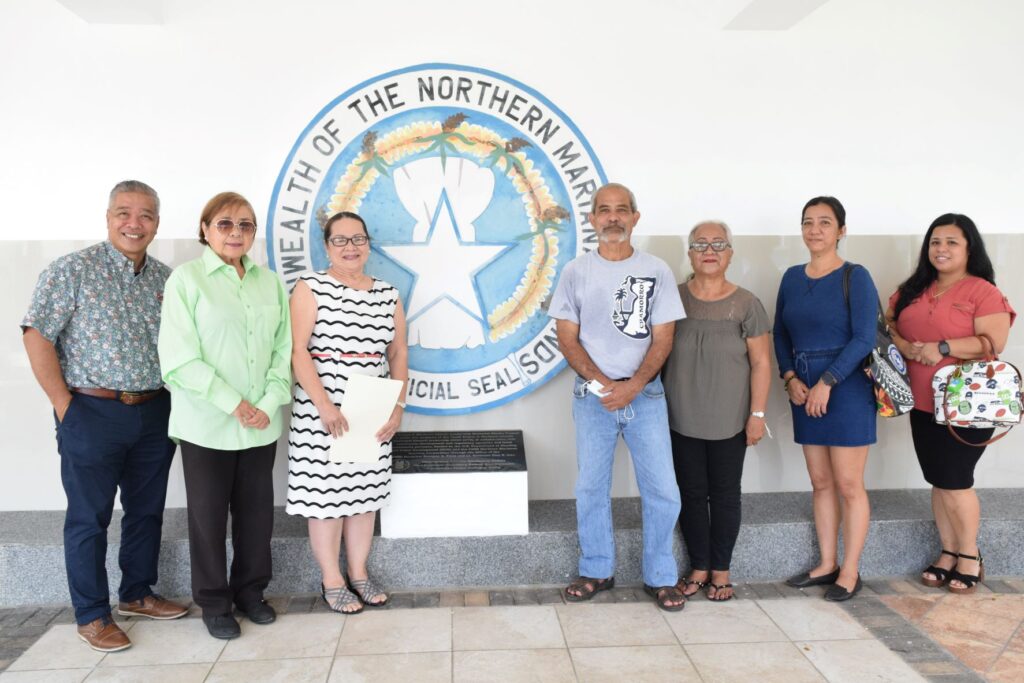 At the Kiosku Round House in Chalan Kanoa on Friday, Master of Arts and Culture Eusebio Camacho Borja, 4th right, poses for a photo with, from left, Saipan and Northern Islands Municipal Council Secretary Daniel I. Aquino, Vice Chair Antonia M. Tudela and Chairwoman Ana Demapan-Castro. Also in the photo are Eusebio’s wife Margarita and daughters, Ann Margaret and Rose Marie