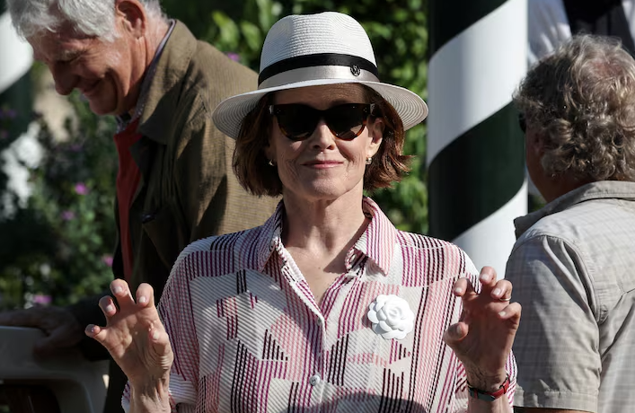 Sigourney Weaver gestures as she leaves the Excelsior hotel during the 81st Venice Film Festival, Venice, Italy, Aug. 29, 2024.