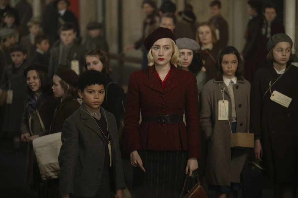 Elliott Heffernan, left, and Saoirse Ronan in a scene from “Blitz.”