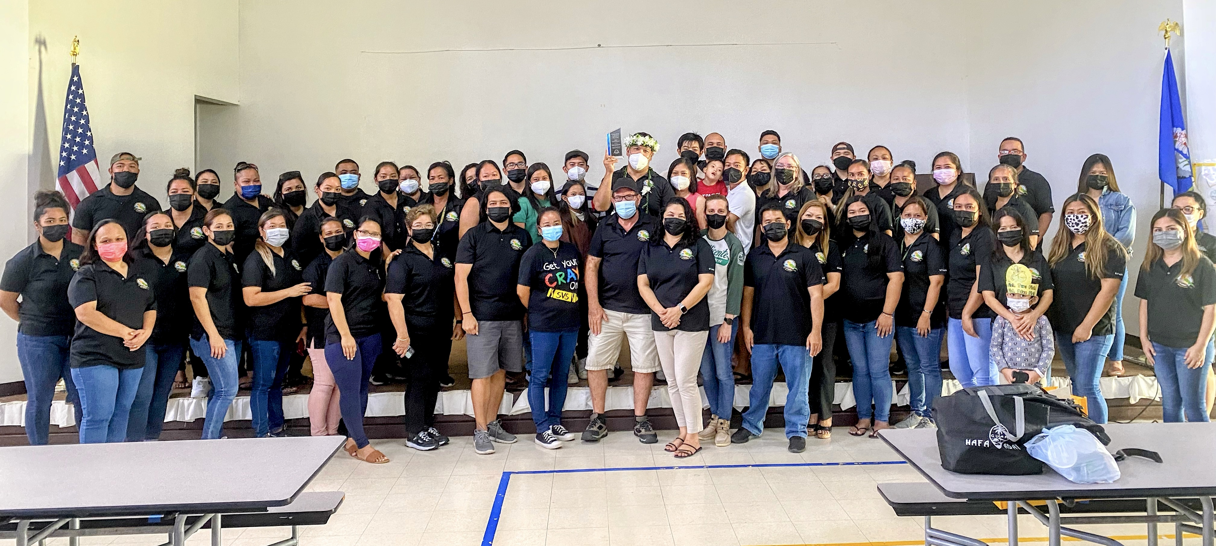 San Vicente Elementary School teacher Dr. Patrick Castillon, center back row, raises his glass trophy after he was named CNMI state finalist for the prestigious Presidential Awards for Excellence in Mathematics and Science and Technology. His SVES family led by Principal Paulette Tomokane and the PSS leadership led by Commissioner of Education Dr. Alfred B. Ada, the PSS Science Program and PAEMST State Coordinator Asapmar Ogumoro congratulated Dr. Castillon who was selected for his outstanding contributions in the field of math and science teaching. The national winners will be announced by the White House.