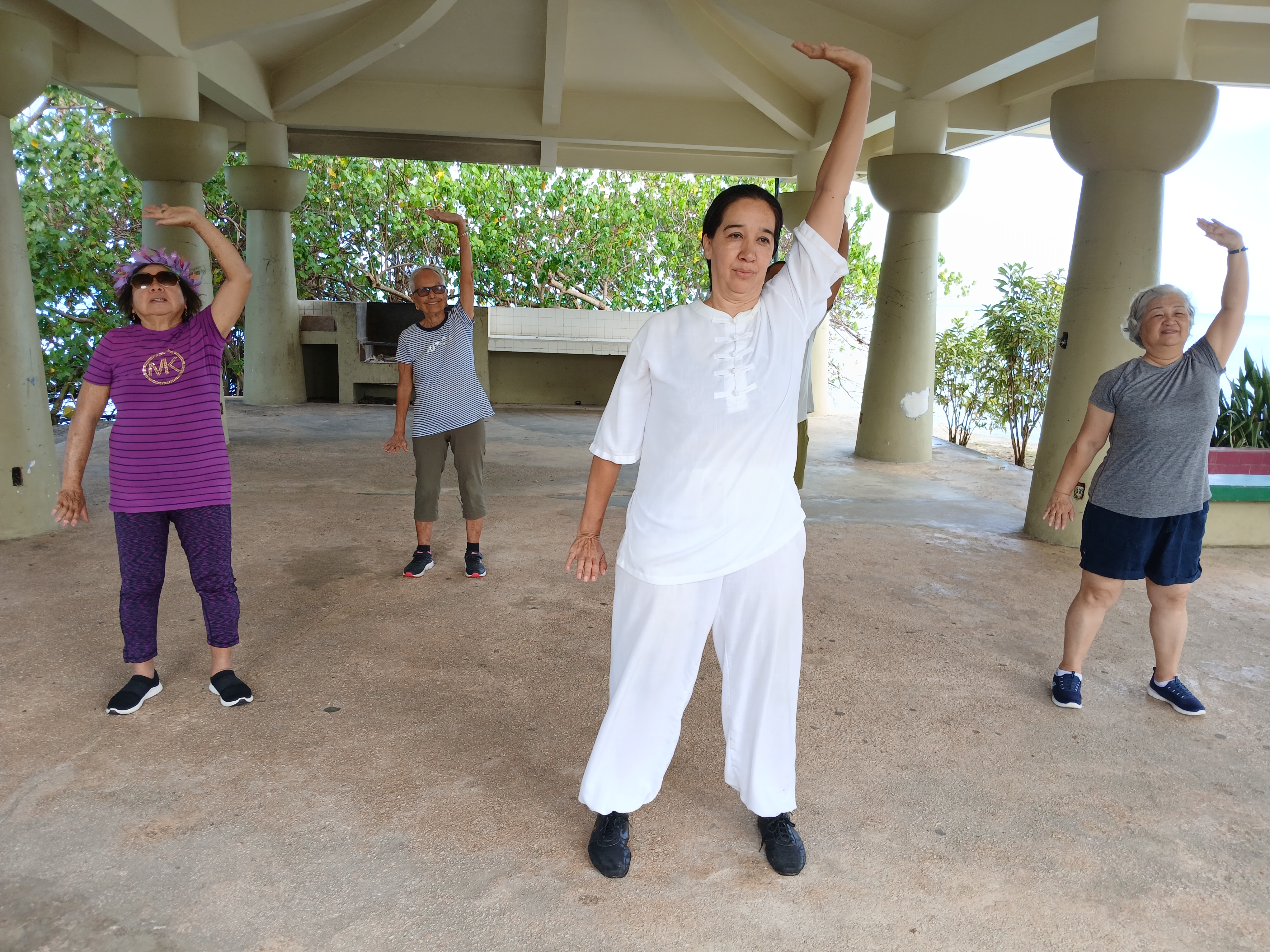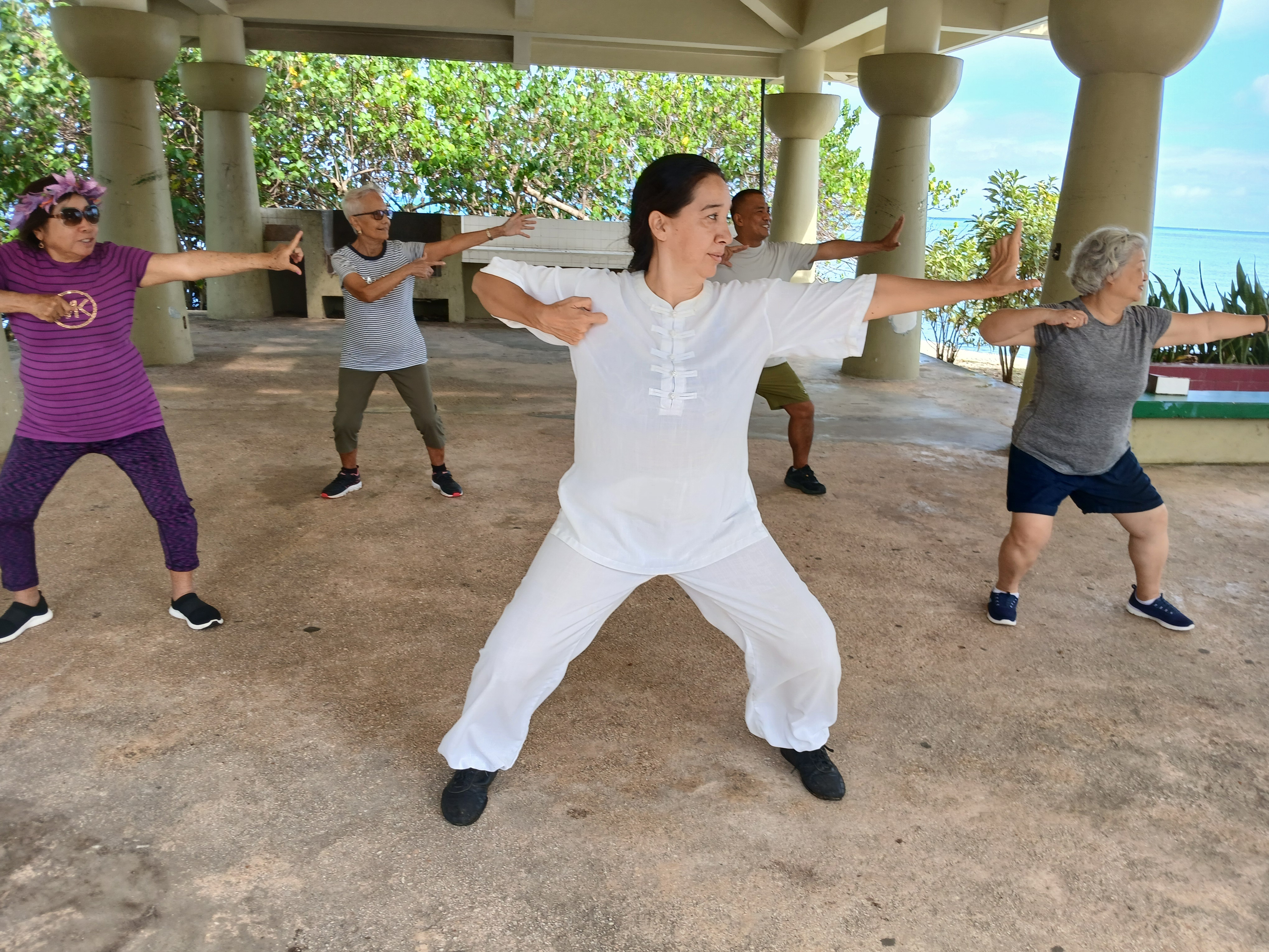 Are you looking for a fun exercise class on island? Consider tai chi that is held at the Micro Beach pavilion every Friday at 7:30 a.m. Catherine Perry, who has practiced tai chi for more than 10 years, leads the class which is free. The class is open to women and men. Catherine says tai chi will improve one’s physical, mental, and emotional health. For attire, comfortable clothing and shoes are all that you need. In photo are Lupe Sabino, Lupe Robinson, Catherine Perry, Vernon, and Carol Chan Wong at the Micro Beach pavilion on Friday, April 11, 2025.