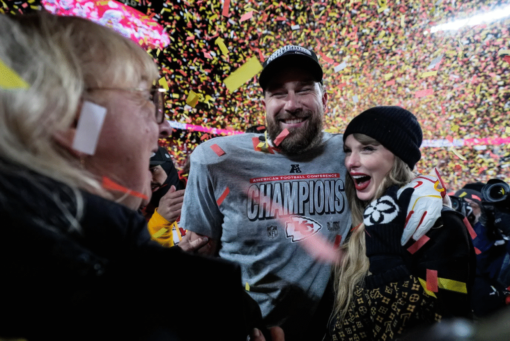 Donna Kelce stands with her son Kansas City Chiefs tight end Travis Kelce and Taylor Swift after the AFC Championship NFL football game against the Buffalo Bills, Jan. 26, 2025, in Kansas City, Mo.AP