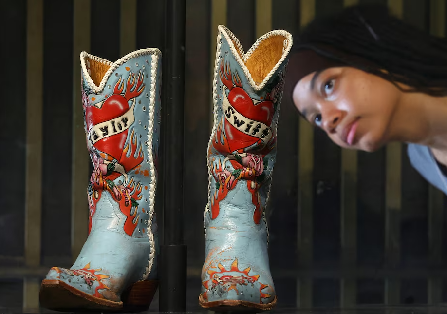 Employee Saffron poses as she views cowboy boots worn and loaned by Taylor Swift, which form part of the Taylor Swift Songbook Trail exhibition celebrating the work of the music artist at the V&A Museum in London, Britain, July 24, 2024.