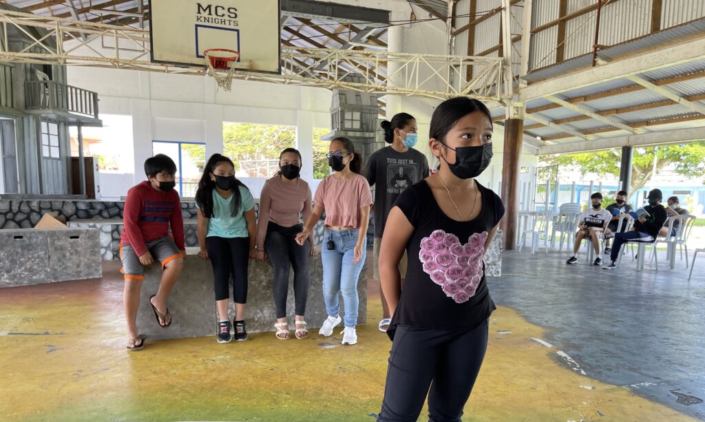 Neia Dolana Duenas Tagabuel, front, who plays Gretl von Trapp in the Mount Carmel School Theatre Club production of “The Sound of Music,” rehearses with fellow cast member in the school’s cafeteria, which provides better air ventilation in order to prevent the transmission of Covid-19. The school has taken such precautionary measures to keep students and the community safe and healthy.