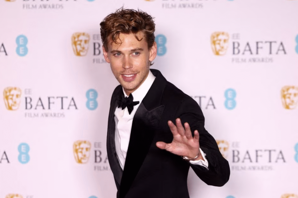 Austin Butler poses after winning the award for Best Leading Actor for “Elvis” during the 2023 British Academy of Film and Television Arts  Film Awards at the Royal Festival Hall in London, Britain, Feb. 19, 2023.