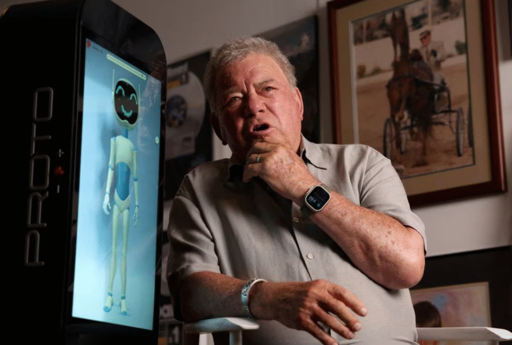 The actor best known for playing Captain Kirk on “Star Trek” talked with ProtoBot, a device that combines holographic visuals with conversational AI, and grappled with philosophical and ethical questions about the technology.